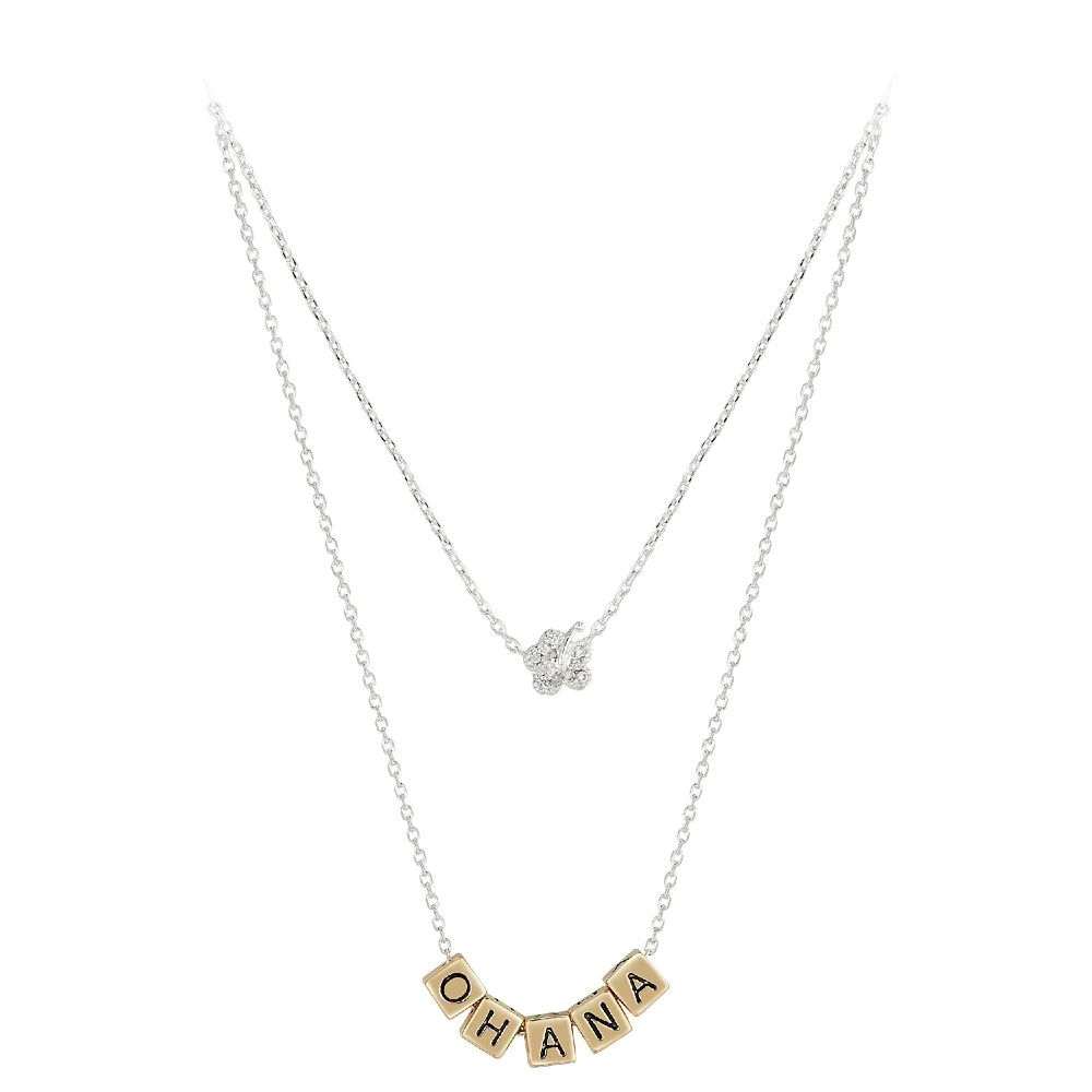 Gold block letters spell out ”OHANA” on this necklace that includes an attached chain with a hibiscus flower charm encrusted with cubic zirconia. Inspired by Disney’s Lilo & Stitch, it’s a sparkling reminder that ohana means family.