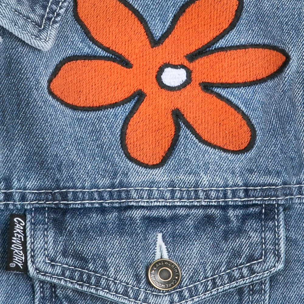 Flower child Lizzie McGuire blossoms on the back of this denim jacket. The cartoon character is embroidered in a thoughtful pose as she sits and contemplates her teenage life. The classic faded denim jacket is covered in colorful embroidered flowers so you’ll be happy to be an outfit repeater, just like Lizzie.