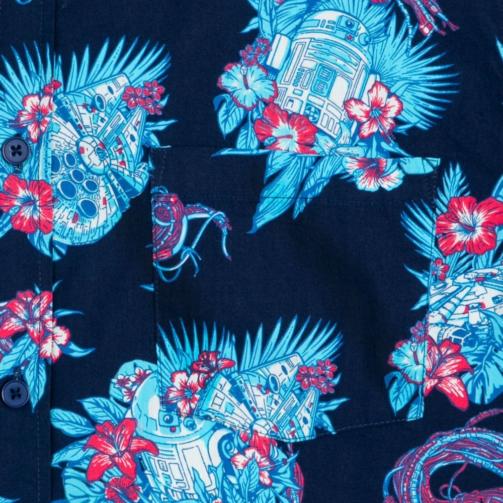 - Allover tropical print pattern features Millennium Falcon and R2-D2