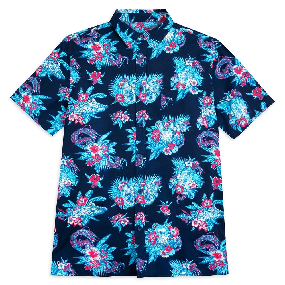 Star Wars sails to the islands for this awesome aloha shirt featuring the Millennium Falcon and R2-D2. With a button front, collar, chest pocket and shirttail hem, it’s a classic look merging tropical and intergalactic styles.