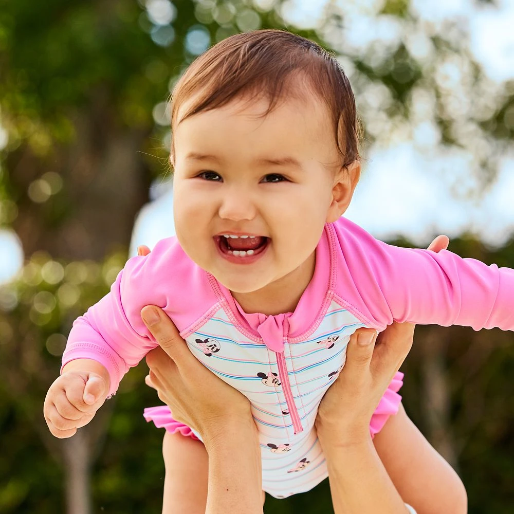Your baby can hit the beach or pool in oh-so-sweet style in this adorable one-piece bathing suit featuring Minnie Mouse. The rash guard-style suit has contrasting long sleeves, front zip, ruffled detailing at hips, plus snaps between the legs for easy on and off.