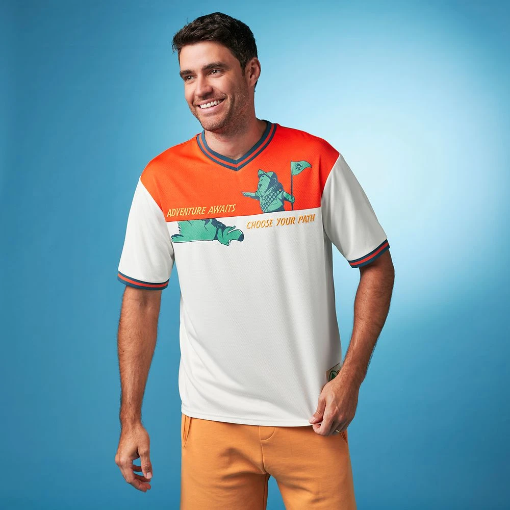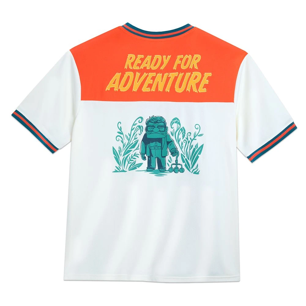 Despite being reliant on his trusty walker, Carl Fredricksen is ”Ready for Adventure” as shown by this athletic jersey inspired by Disney and Pixar’s Up. The front features that enthusiastic Wilderness Explorer Russell and talking dog Dug along with motivational slogans. A contrasting yoke, striped ribbing and perforated fabric give it a sporting look that makes it a real winner.